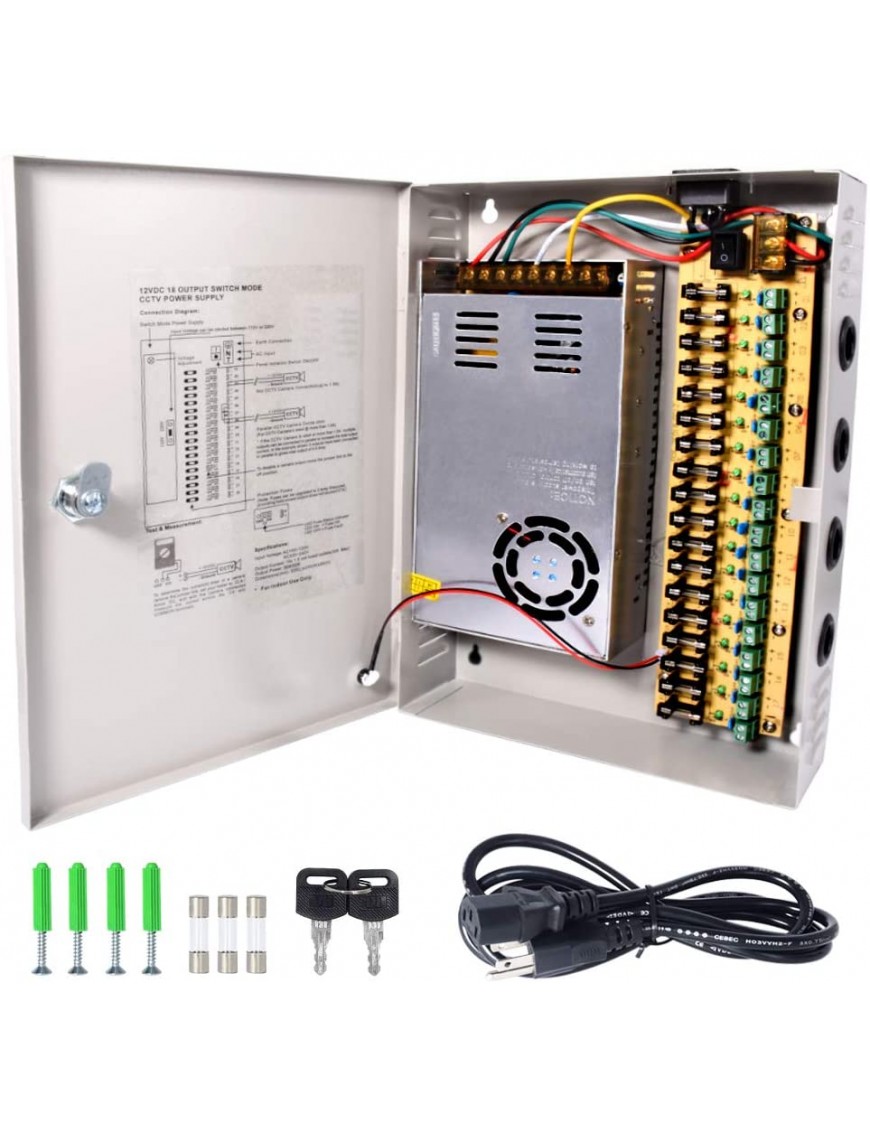 - DC 12V 30A 360W CCTV Power Supply Box, 18 Channel Outputs is Protected with Fuse;